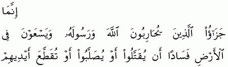 إ ن م ا ج ز اء ال ذ ين ي ح ار ب ون الل ه و ر س ول ه و ي س ع و ن ف ي ال أ ر ض ف س اد ا أ ن ي ق ت ل وا أ و ي ص ل ب وا أ و ت ق ط ع أ ي د يه م و أ ر ج ل ه م م ن خ ل اف أ و ي ن ف و ا م ن ال أ ر ض ذ ل ك ل ه م خ ز ي ف ي الد ن ي ا