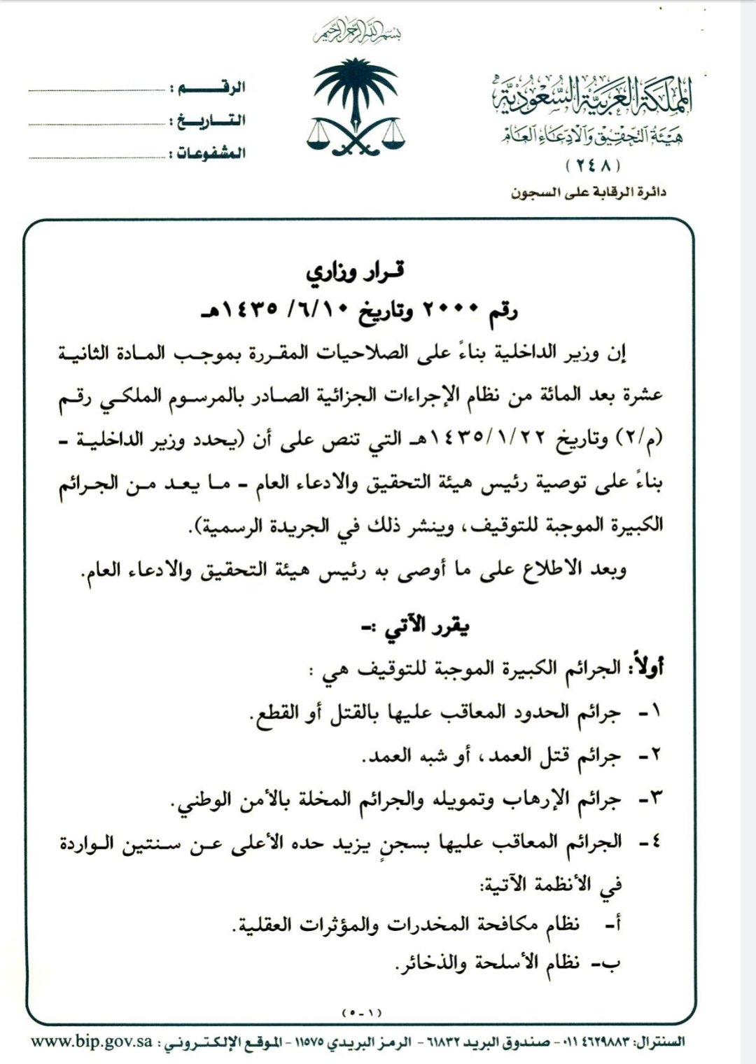 كما نص المنظم السعودي على جريمة الابتزاز الإلكتروني باعتبارها من الجرائم الكبيرة الموجبة للتوقيف وذلك بنص القرار الوزاري رقم 2000 بتاريخ 1435 هـ بشأن الجرائم الموجبة للتوقيف حيث تضمنت الفقرة رابعا أن جرائم نظام. 2 جرائم قتل العمد أو شبه العمد.